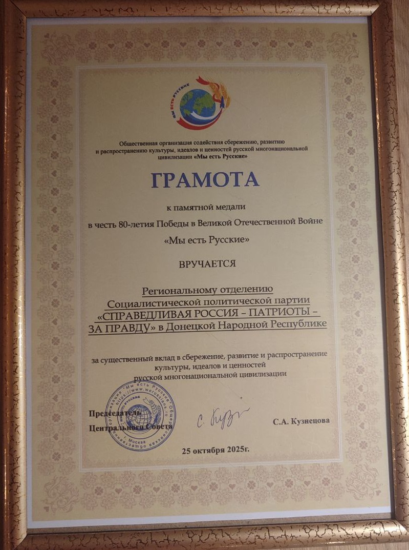 • Почётной Грамоты за неоценимый вклад в сбережение и развитие культуры, идеалов и ценностей нашей великой русской цивилизации!
