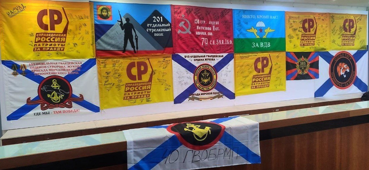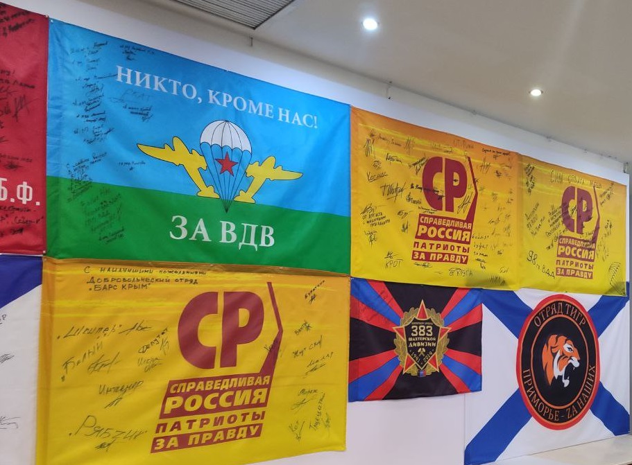 флаги Партии и батальона имени 383-й Шахтёрской дивизии с подписями бойцов СВО, вымпел 110-й отдельной гвардейской мотострелковой ордена Республики бригады и шевроны.