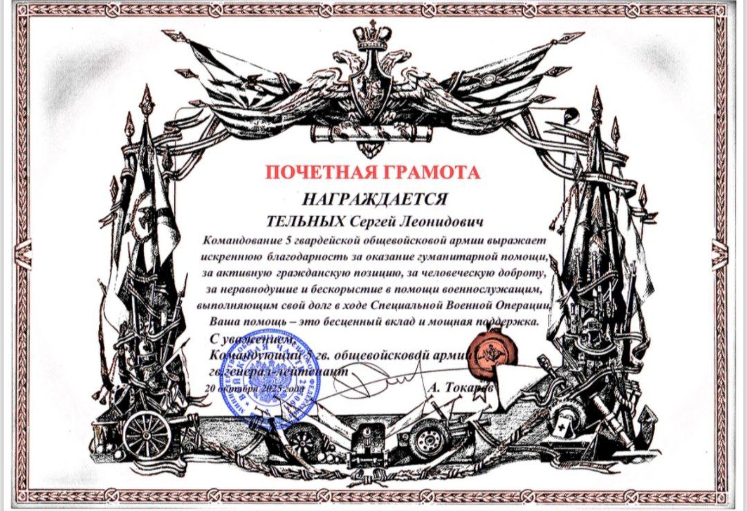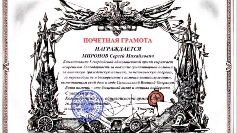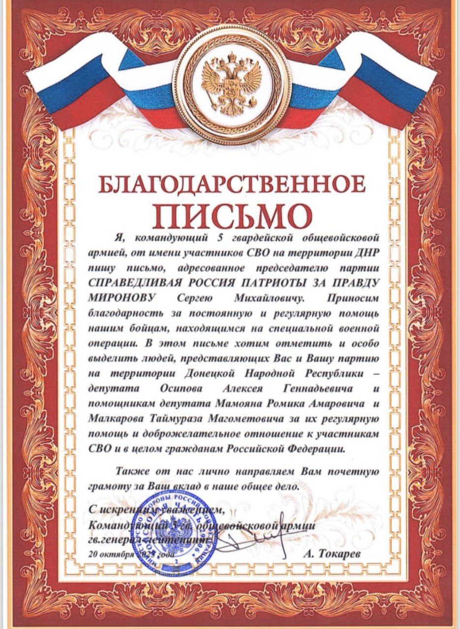 Дорогие друзья, у нас по-настоящему душевная новость! В адрес Председателя Партии СПРАВЕДЛИВАЯ РОССИЯ Сергея Михайловича Миронова поступили Благодарственное письмо и Почётная грамота от командующего 5-й гвардейской общевойсковой армией гвардии генерал-лейтенанта Александра Сергеевича Токарева, переданные от имени всех участников Специальной военной операции на территории Донецкой Народной Республики.