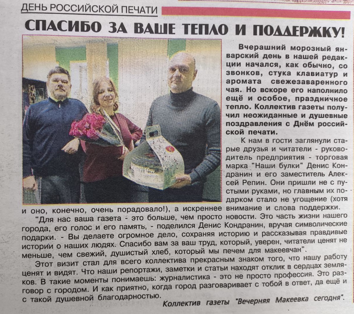 🔥 Мы невероятно гордимся тем, что первый выпуск городской массовой газеты"Вечерняя Макеевка сегодня" вышел со статьёй о наших однопартийцах и дружной команде предприятия – торговой марки "Наши булки" на первой полосе!