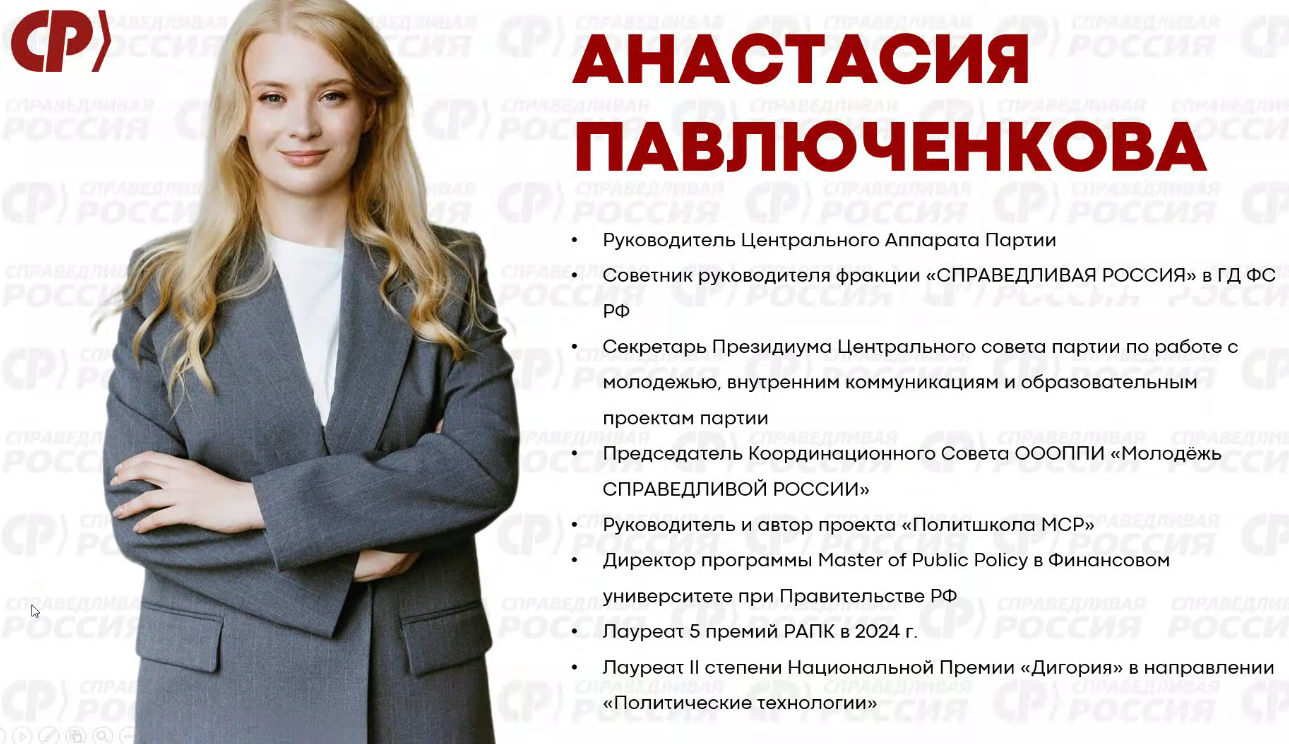 🎤 СПИКЕРОМ выступила Анастасия Юрьевна Павлюченкова – Руководитель Центрального Аппарата Партии, Председатель Координационного Совета Молодёжи СПРАВЕДЛИВОЙ РОССИИ.