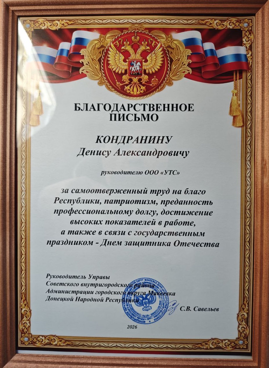 ❤️В канун Дня защитника Отечества в Макеевке состоялось торжественное вручение Благодарственного письма Управы Советского внутригородского района. Награду получил Председатель Совета Макеевского городского местного отделения Партии СПРАВЕДЛИВАЯ РОССИЯ, директор ООО "УТС" Денис Кондранин.