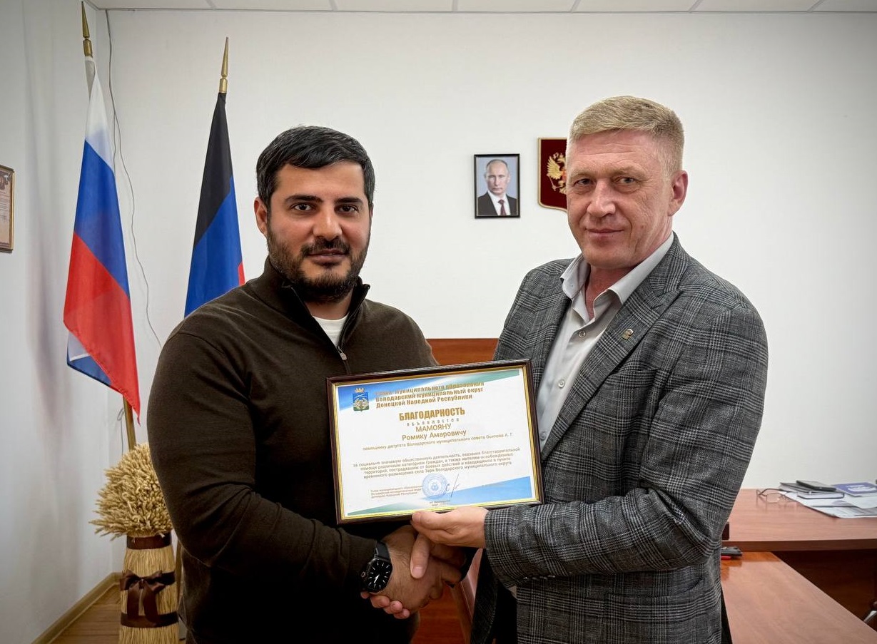 Председатель Совета Мариупольского городского местного отделения Партии СПРАВЕДЛИВАЯ РОССИЯ, депутат Володарского муниципального совета Алексей Осипов и член Совета Ромик Мамоян были отмечены Благодарностью главы муниципального образования Володарский муниципальный округ ДНР Сергея Васильевича Юзвинкевича.